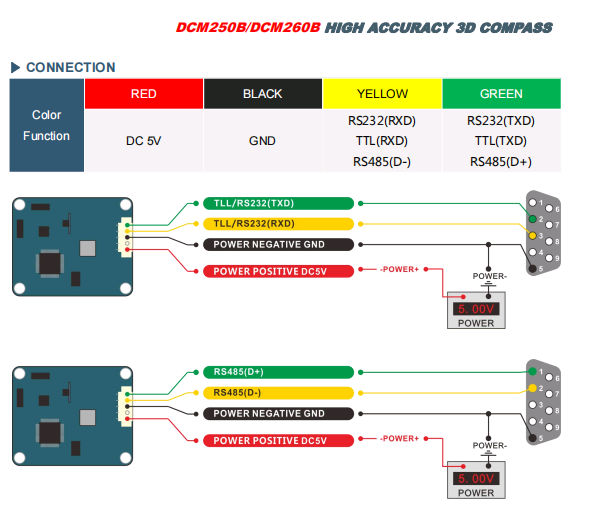 DCM250B is a low-cost 3D electronic compass (Single board), Hard magnetic and soft magnetic calibration algorithms are adopted, make the compass eliminate the magnetic influence through calibration algorithm in the magnetic interference environment ,DCM250B integrated three-axis fluxgate sensor, in real time solver heading through the central processor, and using 3-axis accelerometer to proceed heading compensation for the wide range tilt angle, to ensure the compass still can provide high-precision heading data when the tilt angle up to ±85°.Electronic compass integrated high-precision MCU control, various output mode, standard interfaces including RS232/RS485/TTL and other interfaces, and accept other communication interface customization.